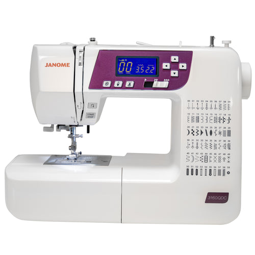 A full-featured machine made with a quilter's needs in mind, the 3160QDC-G will deliver all the benefits of a top-of-the-line model, and at an affordable price. You'll find 60 stitches including 6 one-step buttonholes. Janome's Exclusive Superior Plus Feed System offers specialized box feeding on top of Janome's SFS system, ensuring even, stable feeding with any fabric. And the time-saving features including memorized needle up/down, built-in needle threader, and lock stitch button make sewing easy. The Grapevine color featured on these machines is both trendy and timeless. Best of all, this full-size machine weighs only 12 pounds, so it is easy to take to classes and guild meetings!