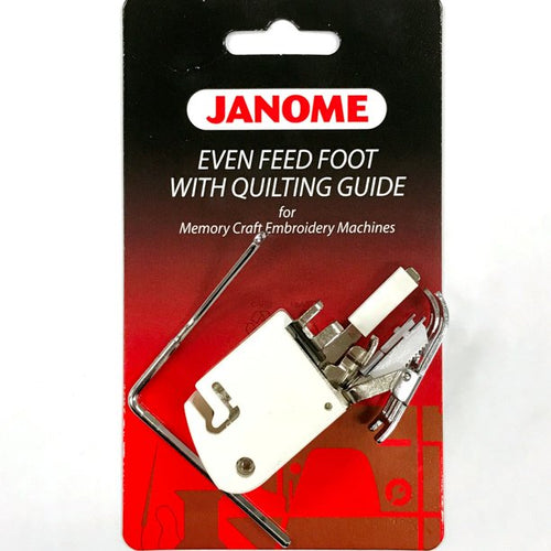 The Even Feed Foot for Memory Craft embroidery machines "walks" over fabric to assist with smooth feeding. With this foot, fabric can be sewn without shifting or puckering since the fabric is gripped and fed by both upper and lower feed dogs. It works well with materials such as knit, vinyl or leather.