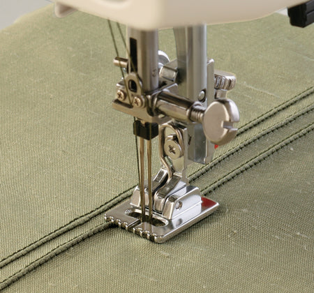 The pintucking foot is used with a 2mm twin needle to create multiple rows of pintucks. The grooves on the underside of the foot make it easy to stitch several rows parallel and evenly spaced from each other