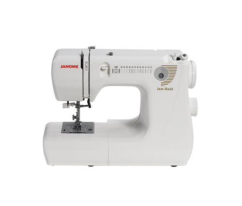 Compact portability and convenience features unite in the Jem Gold 660. Quality components ensure reliability, including a jam-proof drop-in bobbin and horizontal full rotary hook. Convenient extras include a built-in needle threader, one hand thread cutter, fail-safe needle insertion, and quick foot conversion. This 12-lb. machine offers 8 stitches, including 2 stretch stitches and a built-in buttonhole. Standard Janome quality and durability make this 3/4-size machine perfect for a first time sewist or as a quilting machine for taking to classes.