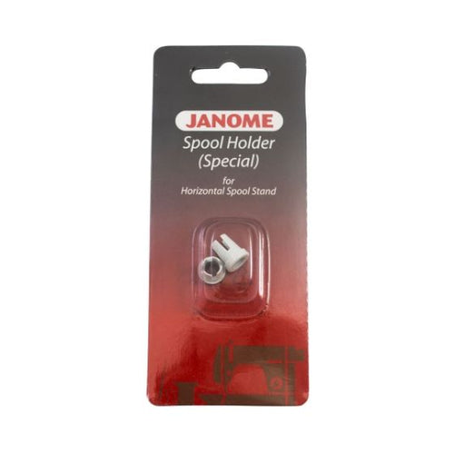 The Janome Special Thread Spool Holder for Horizontal Spool Stand solves the problem of a larger spool of thread not fitting on your horizontal spool pin. Use the Janome Special Thread Spool Holder for Horizontal Spool Stand with all Janome models. The Janome Special Thread Spool Holder for Horizontal Spool Stand allows the spool of thread to be held tight to your spool pin without falling off or creating a gap.