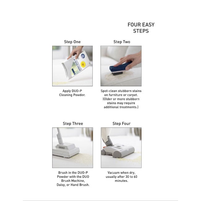 SEBO’s DUO Cleaning System effectively removes stains and cleans large and small carpeted areas, rugs, and upholstery without using water! The DUO-P Powder and specialized Brush Machine can quickly clean a room or house full of carpeting! In addition, the DUO Daisy and Hand Brush quickly clean high-traffic areas, stairs, automobiles, RVs, and boats. This do-it- yourself, dry-cleaning system is highly effective, easy to use, saves time and money, and avoids potential carpet damage caused by some wet-cleaning methods.